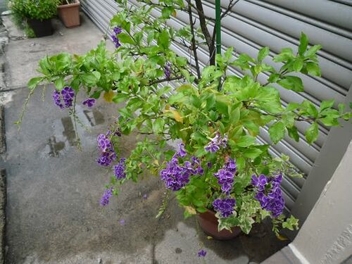 思い切って古い枝を切りそろえた デュランタ宝塚。 随分前に確か北山緑化植物園で購入したもの。 今年は長く咲いています。